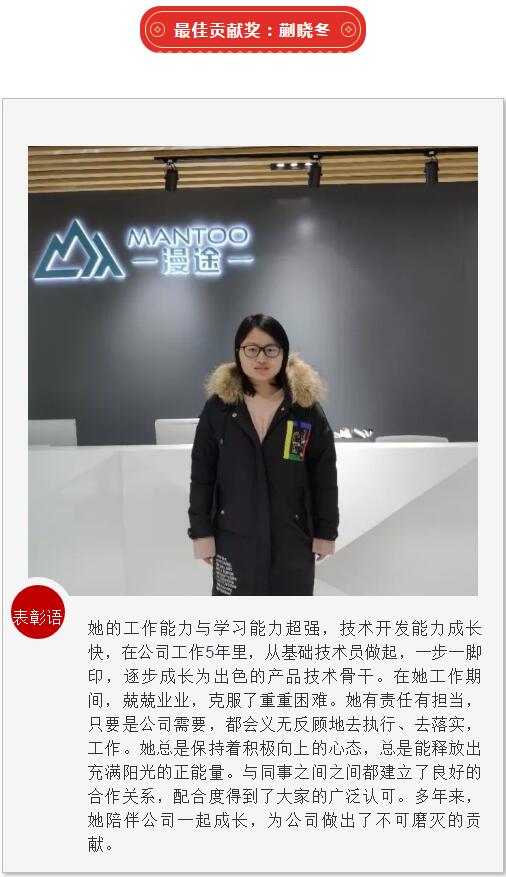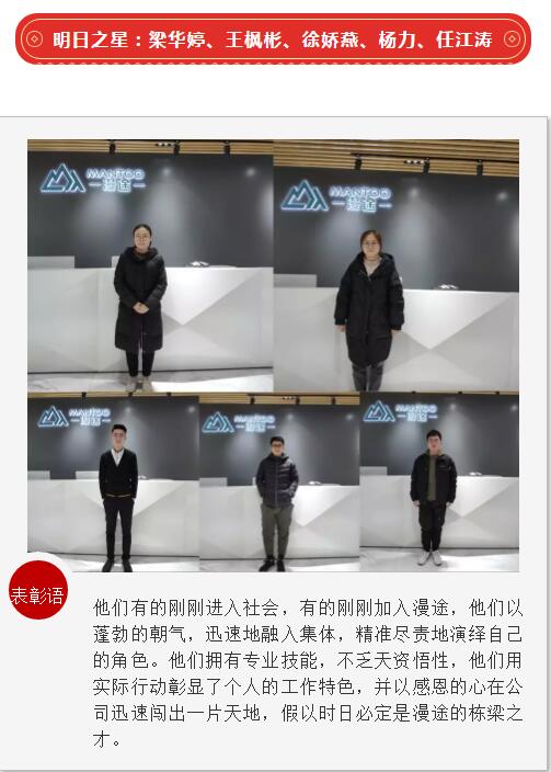 員工是企業(yè)的根基,優(yōu)秀員工更是企業(yè)的制勝法寶。正是他們不懈的努力和無私奉獻(xiàn)換來了漫途的不斷成長。希望受表彰的優(yōu)秀員工,戒驕戒躁,發(fā)揮模范作用,在今后的工作中再接再厲、全力以赴、爭創(chuàng)佳績。