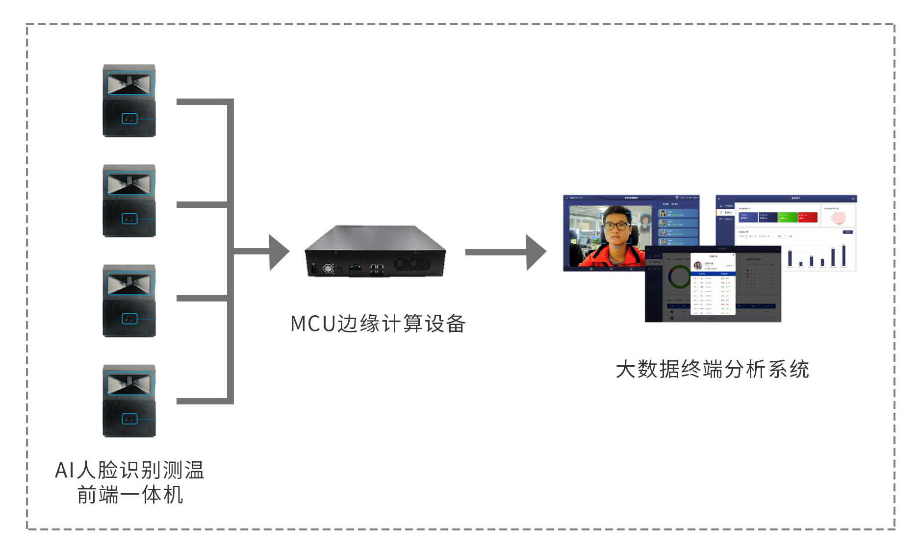 “AI熱成像測溫疫情防控系統(tǒng)”通過部署紅外攝像機+醫(yī)用測溫傳感器的方式獲得人體溫度,其中醫(yī)用測溫傳感器采用德國進口醫(yī)學溫度傳感器,檢測精度高達±0.1℃。再結(jié)合E20通力計算平臺+ECU邊緣計算節(jié)點,通過邊緣計算加護,迅速智能鑒別人流中的高溫人員,再根據(jù)疑似發(fā)燒者的人體、人臉信息,利用人工智能技術輔助工作人員快速定位體溫異常者,實現(xiàn)無感無接觸式體溫異常篩查和預警,有效降低檢測的工作量。