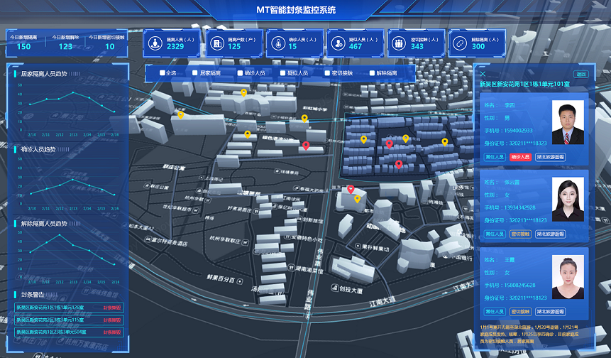 以地圖形式,直觀展示小區內居家醫學觀察人員分布情況,可查詢人員詳情。
