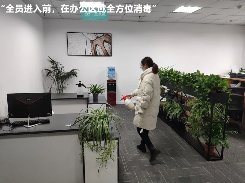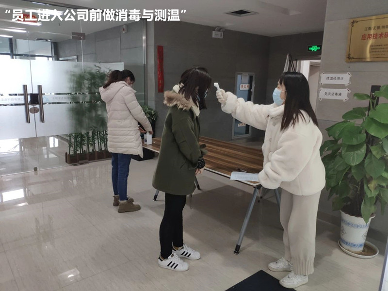 隨著員工陸續到崗,公司消毒、檢查等防控措施更加細心。為員工提供口罩、酒精等必備物品,園區、辦公區域均有專人把守進行測溫、登記、嚴控出入。