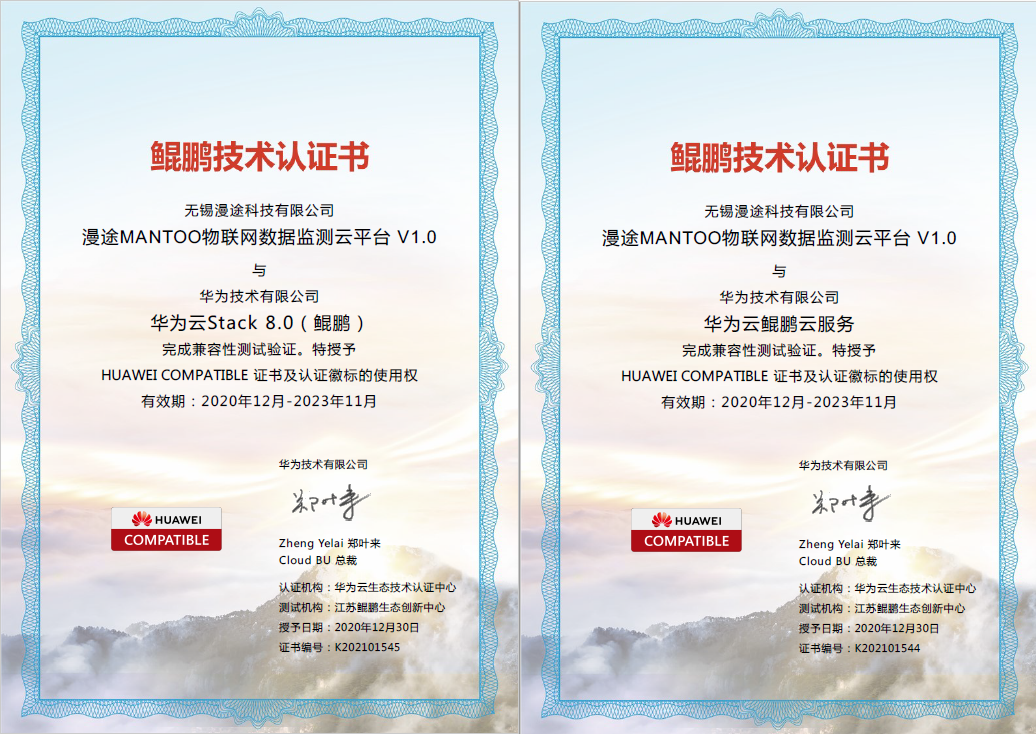 漫途科技產品漫途MANTOO物聯網數據監測云平臺V1.0完成了華為云Stack8.0的兼容性認證及華為云鯤鵬云服務兼容性測試驗證。此次完成兼容性認證,充分表明了漫途自主創新的技術能力得到了華為的高度認可,是對漫途產品安全可靠,性能卓越的證明。