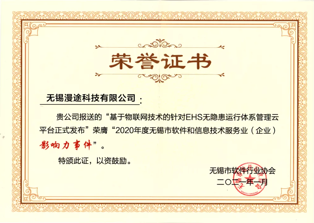 2021年1月,漫途科技收到了軟件行業協會寄來的一份榮譽證書--漫途科技報送的“基于物聯網技術的針對EHS無隱患運行體系管理云平臺正式發布”榮膺“2020年度無錫市軟件和信息技術服務業(企業)影響力事件”。