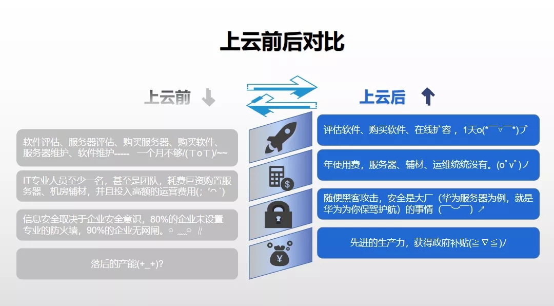企業上云的好處是顯而易見的,企業不需要把過多的精力放在IT基礎設施層面,而是把更多的精力放在業務創新上面。在云計算火爆的今天,企業需要考慮的不是要不要上云,而是如何上云和用好云。在效率、成本、安全、收益方面上云前后的變化非常明顯。以一個和IT有關的項目為例: