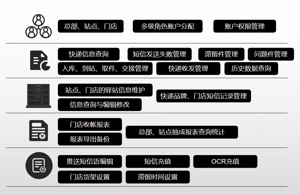 ③驛站管理:支持各站點、門店的驛站信息維護、快遞品牌及門店短信記錄管理,支持信息查詢與編輯修改。
