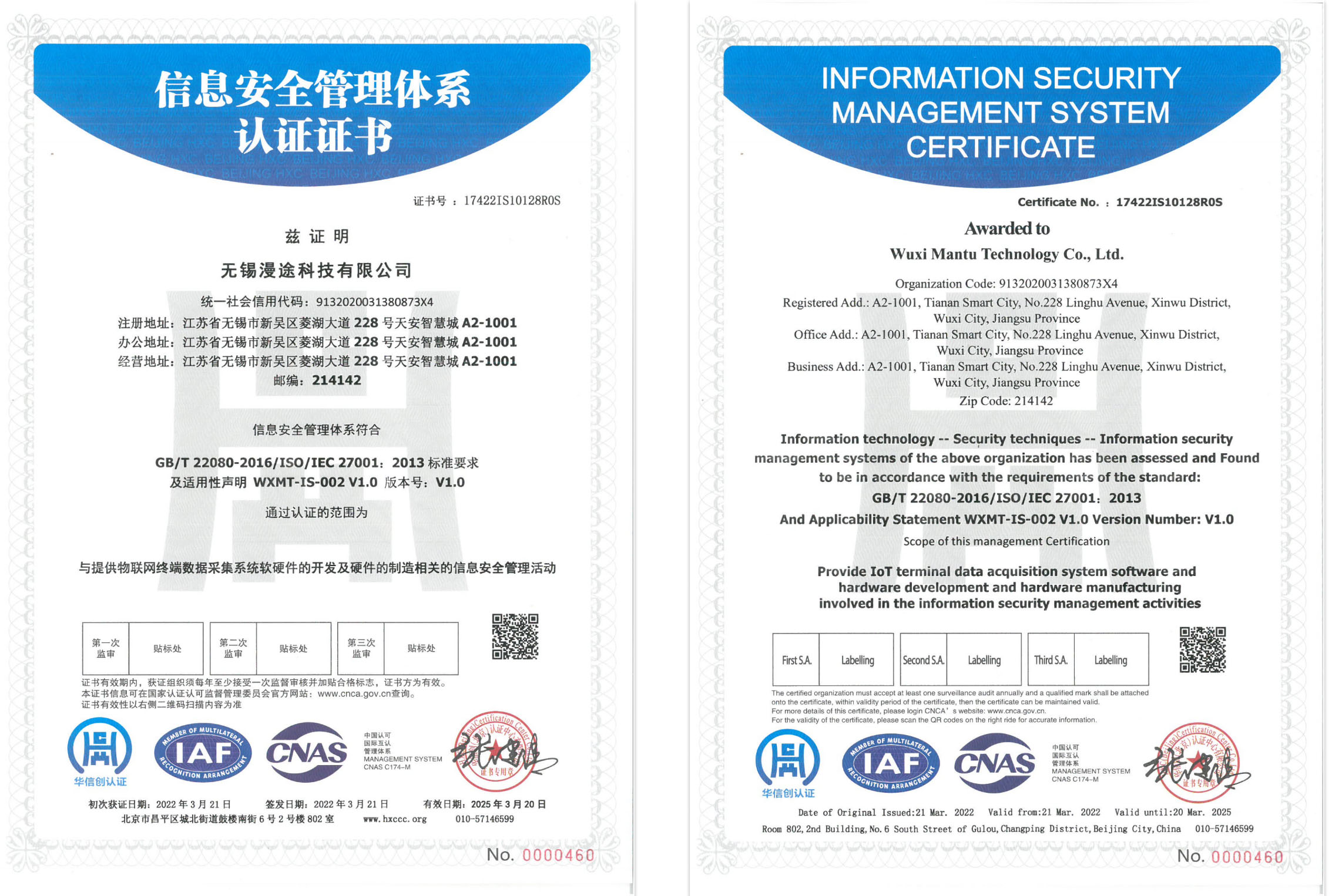 2022年3月21日無錫漫途科技有限公司通過“GB/T220802016/ISO/IEC27001:2013標(biāo)準(zhǔn)要求及適用性聲明WXMT-IS-002 V1.0 版本號(hào):v1.0 信息安全管理體系認(rèn)證 ”