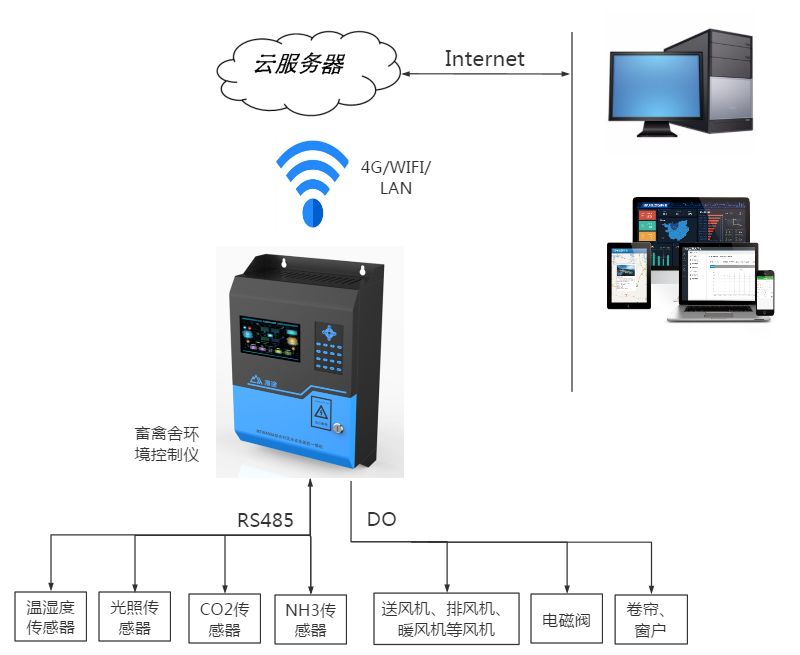 畜禽舍環(huán)境控制儀是集成了RS485接口、以太網(wǎng)口、多路開關(guān)量輸入、多路繼電器輸出和無線數(shù)據(jù)通信于一體的高性能設(shè)備,可以對現(xiàn)場環(huán)境監(jiān)測傳感器數(shù)據(jù)實時采集,并將數(shù)據(jù)發(fā)送給遠程監(jiān)測平臺,可對現(xiàn)場各類控制裝置進行遠程控制,支持本地高清觸摸屏在線顯示、本地數(shù)據(jù)存儲、歷史數(shù)據(jù)查看、參數(shù)設(shè)置。在系統(tǒng)中用于采集現(xiàn)場環(huán)境數(shù)據(jù)和設(shè)備控制,并通過WIFI連接現(xiàn)場WIFI熱點,并將數(shù)據(jù)穩(wěn)定快速上傳至云平臺。