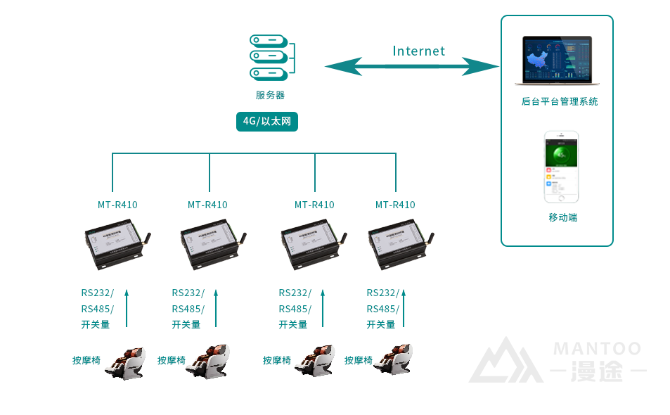漫途科技作為長三角區域集研發與智造能力于一身的工業物聯網服務商,根據該公司的需求,利用物聯網技術,搭配MT-R410 4G智能測控終端,為其研發出了集合數據采集傳輸、自動控制功能為一體的共享按摩椅云平臺系統。該產品幫助該公司解決了平臺管理、手機端用戶掃碼選套餐、維修人員維修工單三部分問題,使該公司有效地提高按摩椅的使用效率、降低了運營和維修成本。