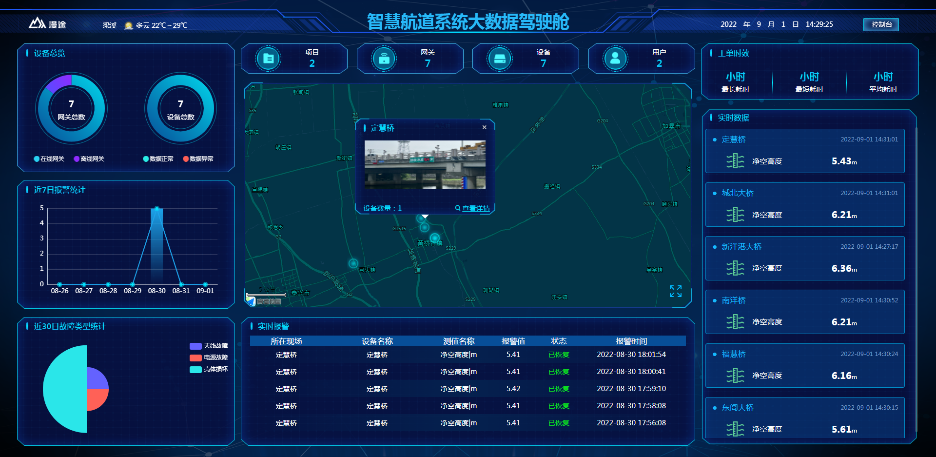 本系統(tǒng)采用高精度電子雷達液位計實時監(jiān)測航行凈高值,通過自動濾波算法對波浪造成的影響進行自動過濾,并通過LED顯示屏進行實時顯示,同時通過4G智能網(wǎng)關(guān)將數(shù)據(jù)發(fā)送至服務(wù)器端進行存儲,異常數(shù)據(jù)進行平臺推送報警,戶外采用太陽能供電系統(tǒng)提供戶外設(shè)備正常供電。切實加強航道通航能力,確保通航安全。