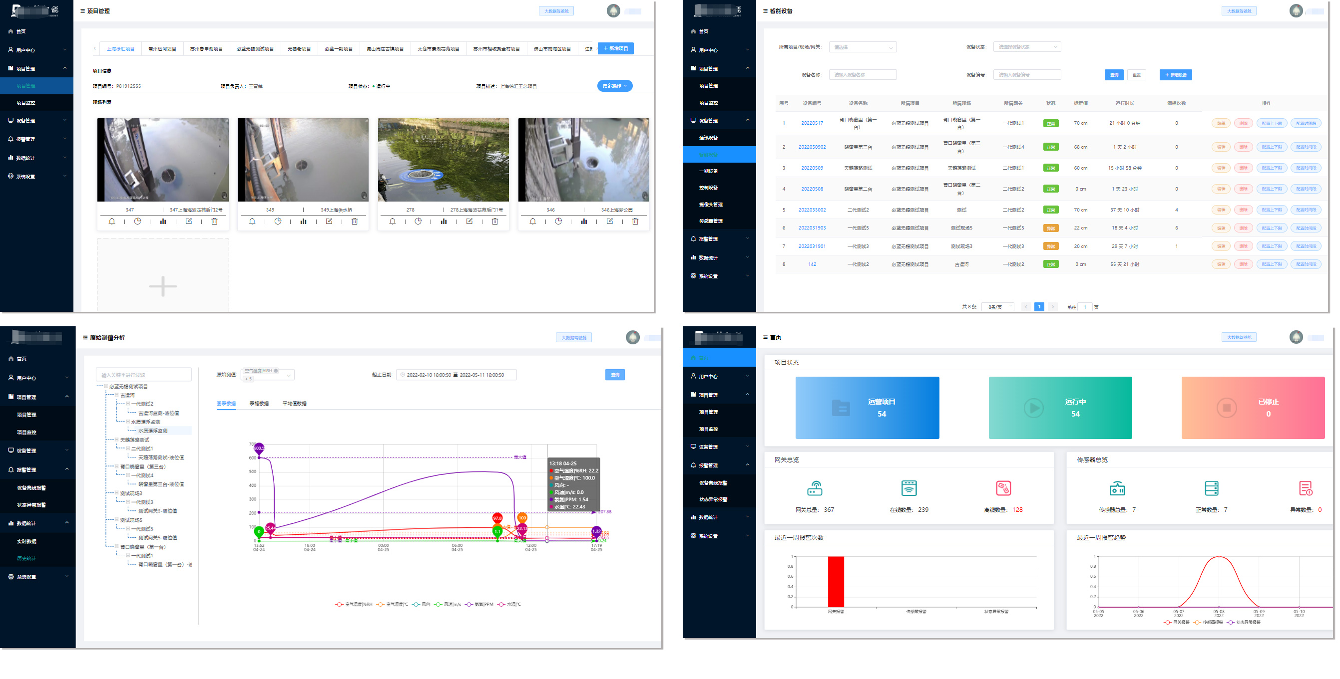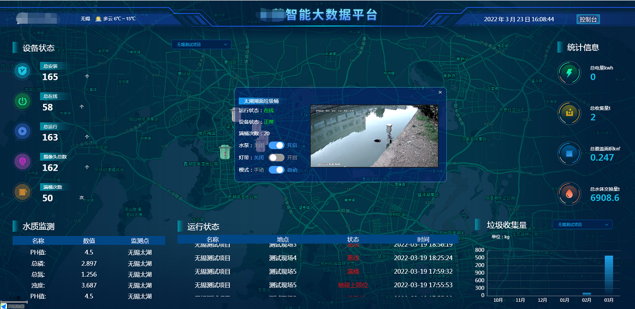 v 可視化看板:實時顯示當前總安裝數量、總運行數量、滿桶次數、總電量、總收集量等統計信息;顯示水質監測實時數據;實時顯示報警數據;垃圾總收集量月度統計。