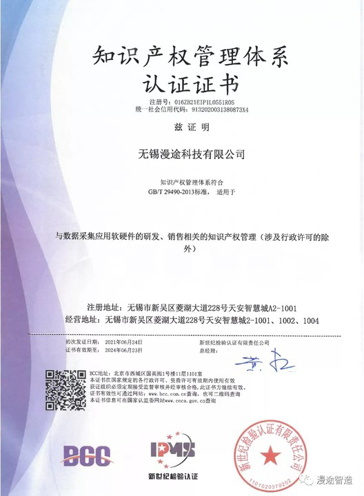 Recently, Wuxi Mantu Technology Co., Ltd. passed the on-site audit of the New Century Inspection and Certification Expert Group and obtained the certification of the intellectual property management system, marking that the company is establishing a standardized system for enterprise intellectual property work, realizing scientific management and strategic application of intellectual property, and improving the competitiveness of international and domestic markets.