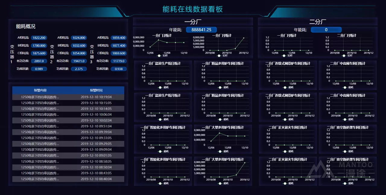 ※ Energy consumption monitoring: Real-time collection of energy meter, transformer and other energy-consuming equipment data, including power consumption, ABC three-phase current, voltage, active power, power factor, etc., from the factory, workshop, production line, day, month, and year dimensions Energy consumption statistics and analysis to achieve energy consumption monitoring.