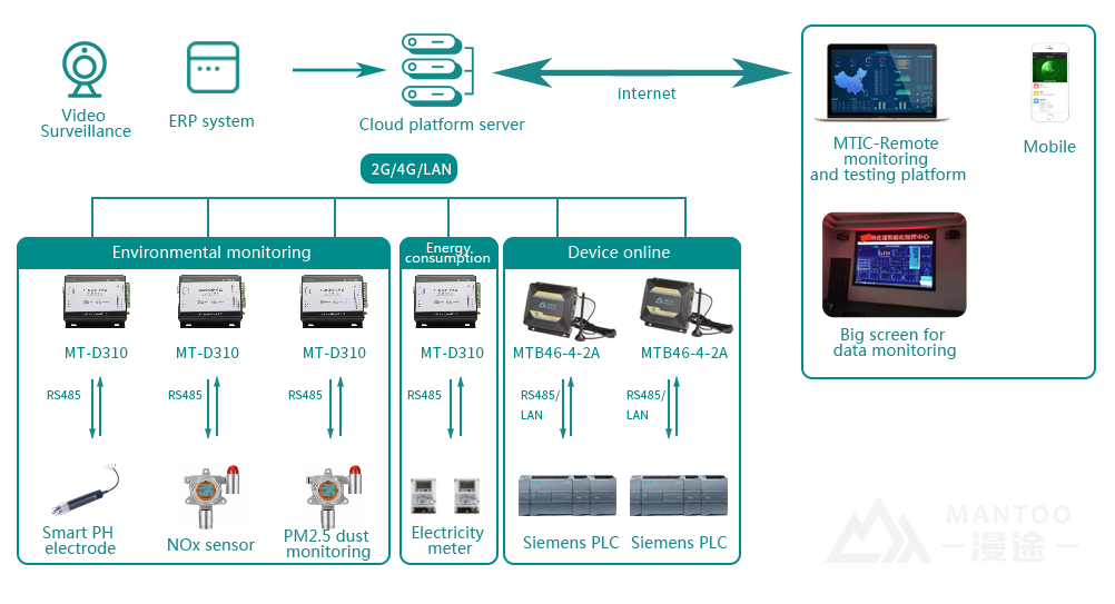 MANTOO, as an industrial IoT service provider with R & D and intelligent manufacturing capabilities in the Yangtze River Delta region, uses the cloud platform, wireless transparent transmission, and edge computing technology in conjunction with intelligent acquisition terminals MT-D310 and MTB- R4642, with sensors and equipment acquisition and transmission as the core, has developed a smart factory online cloud platform system that integrates equipment online, environment online, energy consumption online, and ERP system integration. This product helps the factory to solve the real-time collection, analysis, and early warning of equipment data, environmental data, and energy consumption data, and centralized management of various large equipment. Effectively improve the overall operating efficiency of the enterprise and reduce its operating costs.