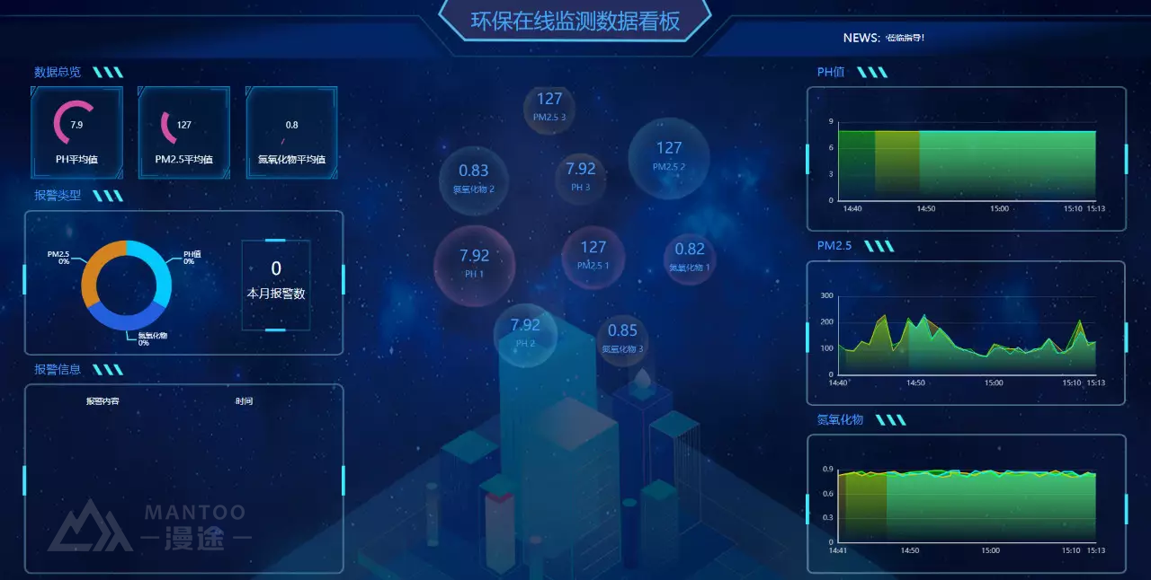 ※ Environmental monitoring: Real-time collection of factory exhaust gas and waste water pollutant content, including PM2.5, nitrogen oxides, PH, etc., can customize alarm rules according to emission standards to achieve factory environmental monitoring.