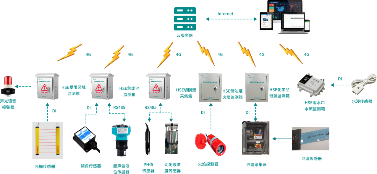 Working principle: collect the environment in the factory in real time through tilt sensor, liquid level sensor, PH, leakage monitoring sensor, grating and other environmental sensors, send the data to the cloud server through the intelligent gateway for storage, and analyze and process the data through HSE software;