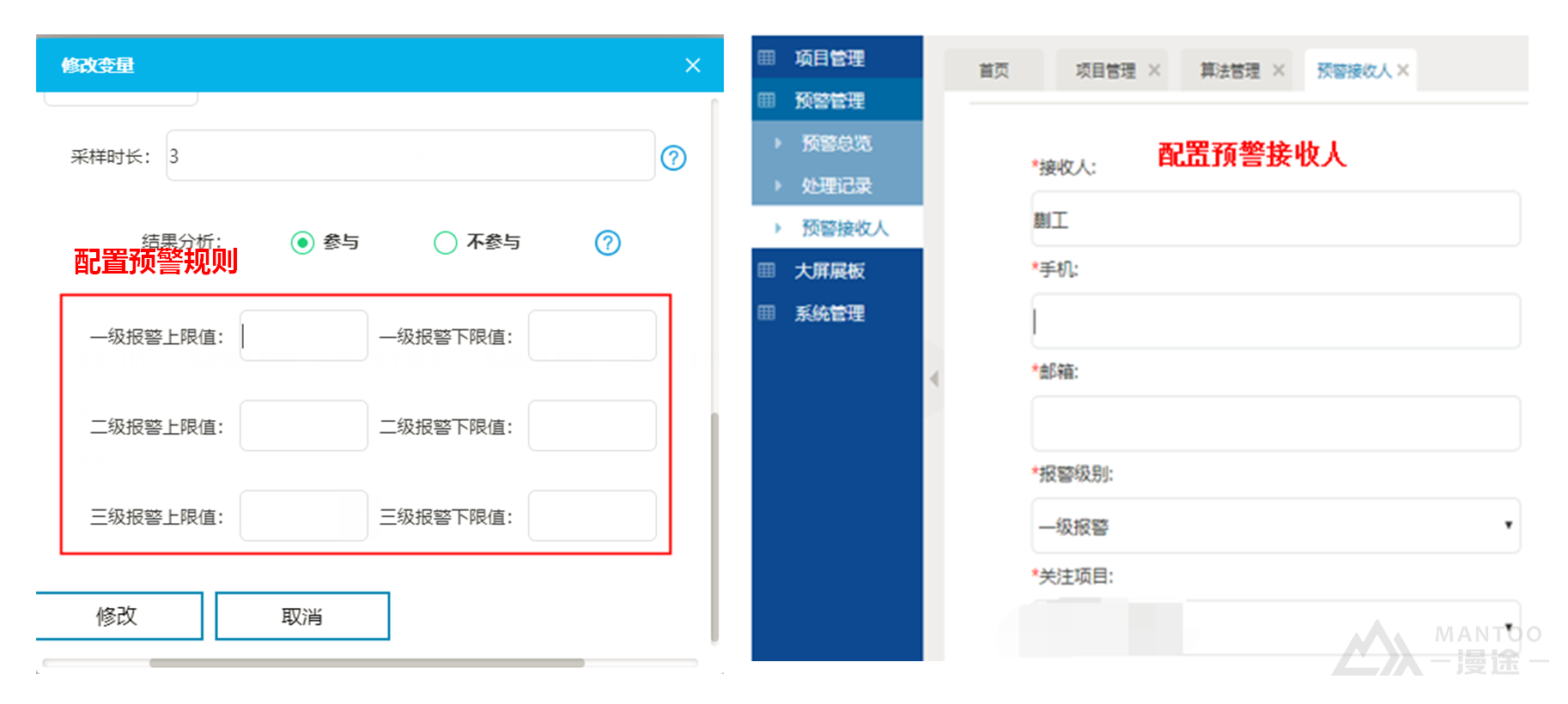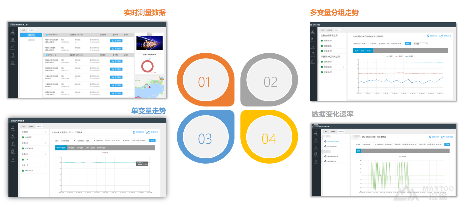 Mantoo cloud network remote measurement and control system control cabinet through the RS485 interface technology to collect the data of each sensor, through the 4G network directly uploaded diffuse cloud real-time view, once the data limit, on-site equipment failure, the remote control terminal will appear alarm information, remind personnel maintenance.