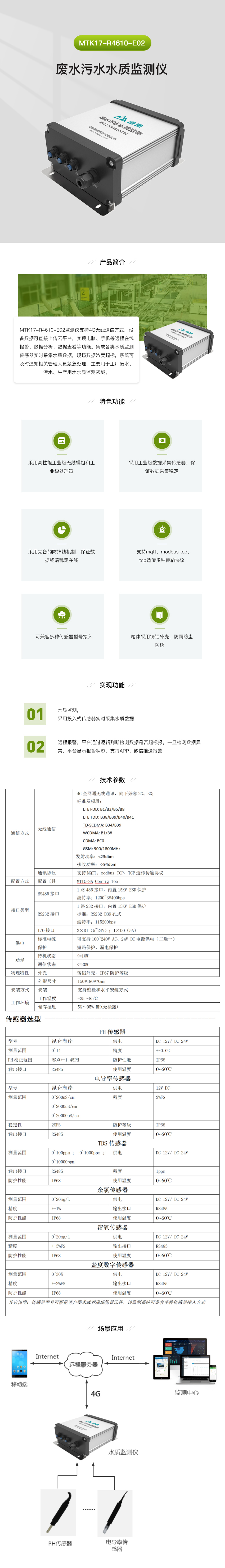 MTK17-R4610-E02監(jiān)測(cè)儀支持4G無(wú)線通信方式,設(shè)備數(shù)據(jù)可直接上傳 云平臺(tái),實(shí)現(xiàn)電腦、手機(jī)等遠(yuǎn)程在線報(bào)警、數(shù)據(jù)分析、數(shù)據(jù)查看等功能。集 成各類水質(zhì)監(jiān)測(cè)傳感器實(shí)時(shí)采集水質(zhì)數(shù)據(jù),現(xiàn)場(chǎng)數(shù)據(jù)濃度超標(biāo),系統(tǒng)可及時(shí) 通知相關(guān)管理人員緊急處理。主要用于工廠廢水、污水、生產(chǎn)用水水質(zhì)監(jiān)測(cè) 領(lǐng)域。