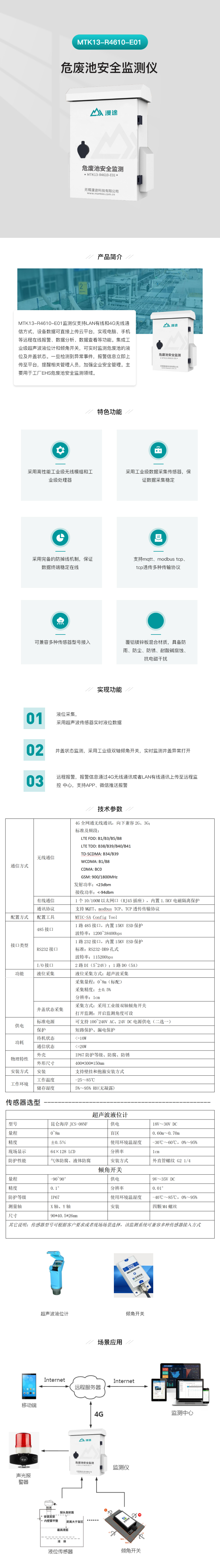 MTK13-R4610-E01監(jiān)測(cè)儀支持LAN有線和4G無線通信方式,設(shè)備數(shù)據(jù) 可直接上傳云平臺(tái),實(shí)現(xiàn)電腦、手機(jī)等遠(yuǎn)程在線報(bào)警、數(shù)據(jù)分析、數(shù)據(jù)查看 等功能。集成工業(yè)級(jí)超聲波液位計(jì)和傾角開關(guān),可實(shí)時(shí)監(jiān)測(cè)危廢池的液位及 井蓋狀態(tài)。一旦檢測(cè)到異常事件,報(bào)警信息立即上傳至平臺(tái),提醒相關(guān)管理 人員,加強(qiáng)企業(yè)安全管理。主要用于工廠EHS危廢池安全監(jiān)測(cè)領(lǐng)域。