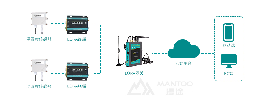 漫途科技基于LoRa無線技術(shù)的溫濕度監(jiān)測預警系統(tǒng)采用漫途LoRa采集器和LoRa網(wǎng)關實現(xiàn)監(jiān)控區(qū)域內(nèi)的全覆蓋,同時在倉儲區(qū)各個數(shù)據(jù)采集節(jié)點安裝漫途溫濕度傳感器,實現(xiàn)對監(jiān)測區(qū)域的溫濕度數(shù)據(jù)動態(tài)全采集,并根據(jù)倉儲環(huán)境實際需求將溫濕度數(shù)據(jù)監(jiān)測、采集、傳輸和預警。數(shù)據(jù)傳輸?shù)組TIC 3.0平臺后進行數(shù)據(jù)分析和優(yōu)化,然后精準推動到WEB服務系統(tǒng)或手機APP實現(xiàn)實時監(jiān)測、調(diào)度管控等。