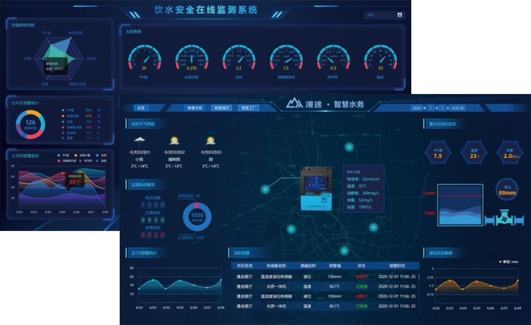 漫途將水務監測與物聯網結構體系、云計算、局域網/通訊網等多技術結合,建立一套智能水務在線監測系統,為水務日常監測、管理和突發應急處置發揮重大作用。基于云計算服務中心的檢測系統可容納上萬個水務監測點的檢測數據,行成區域性水務監測平臺,實現區域內的所有水務統一監控管理。