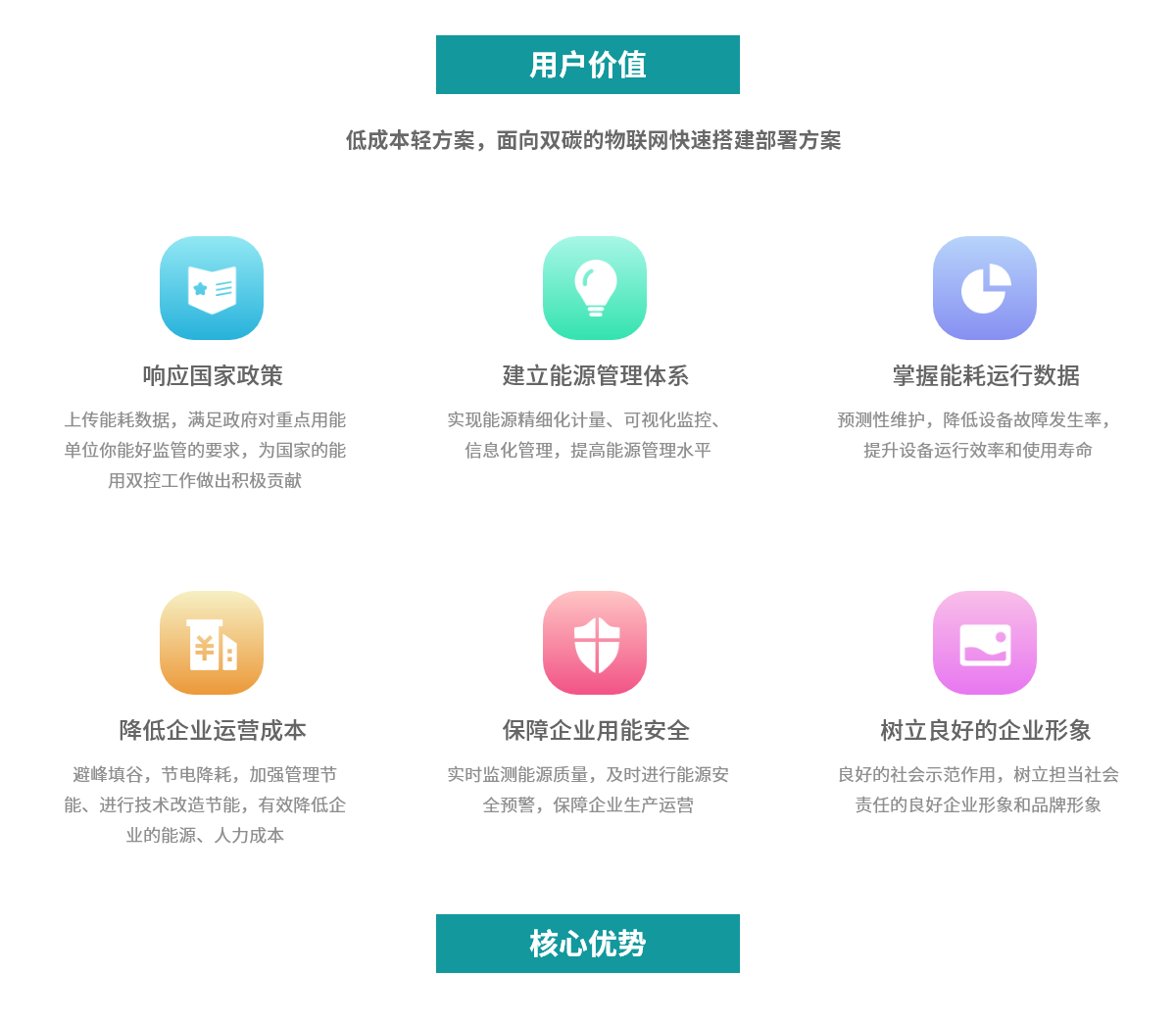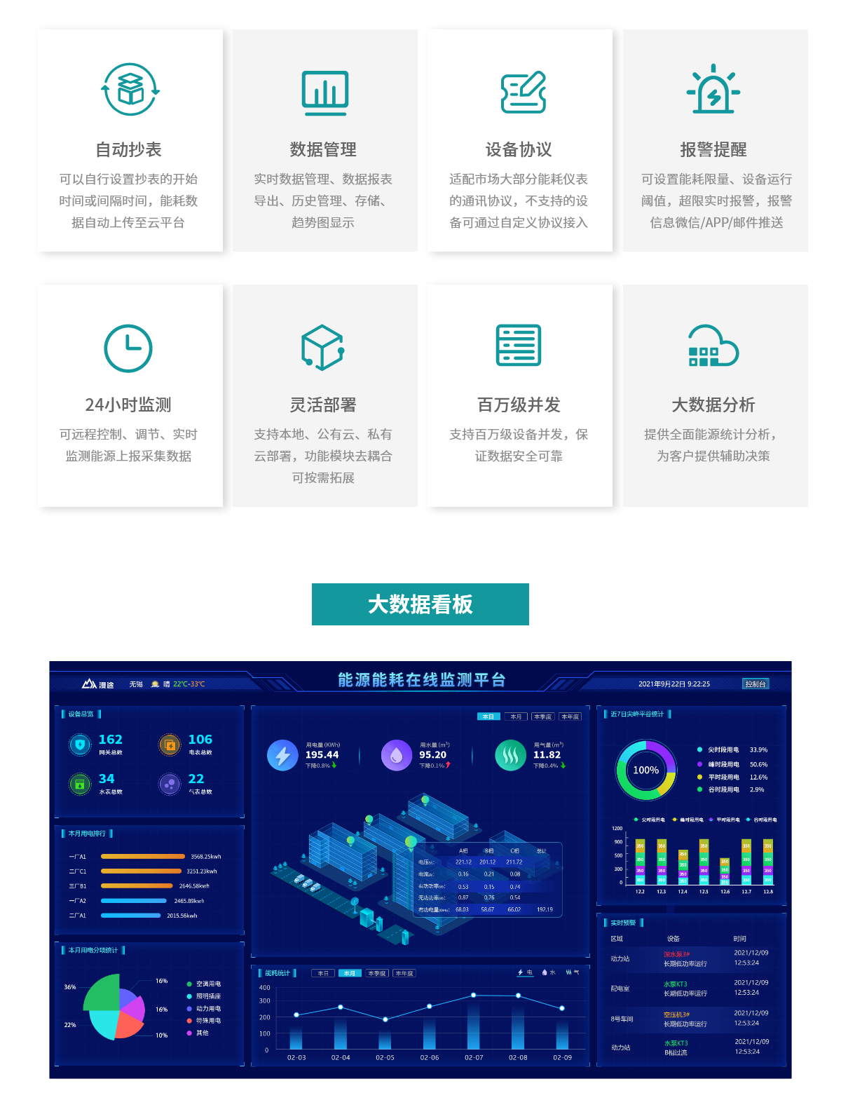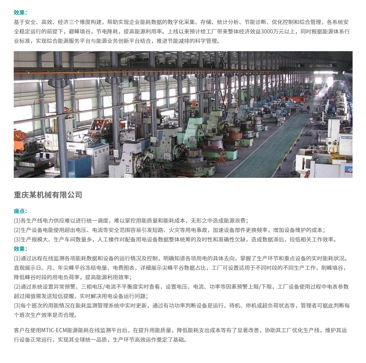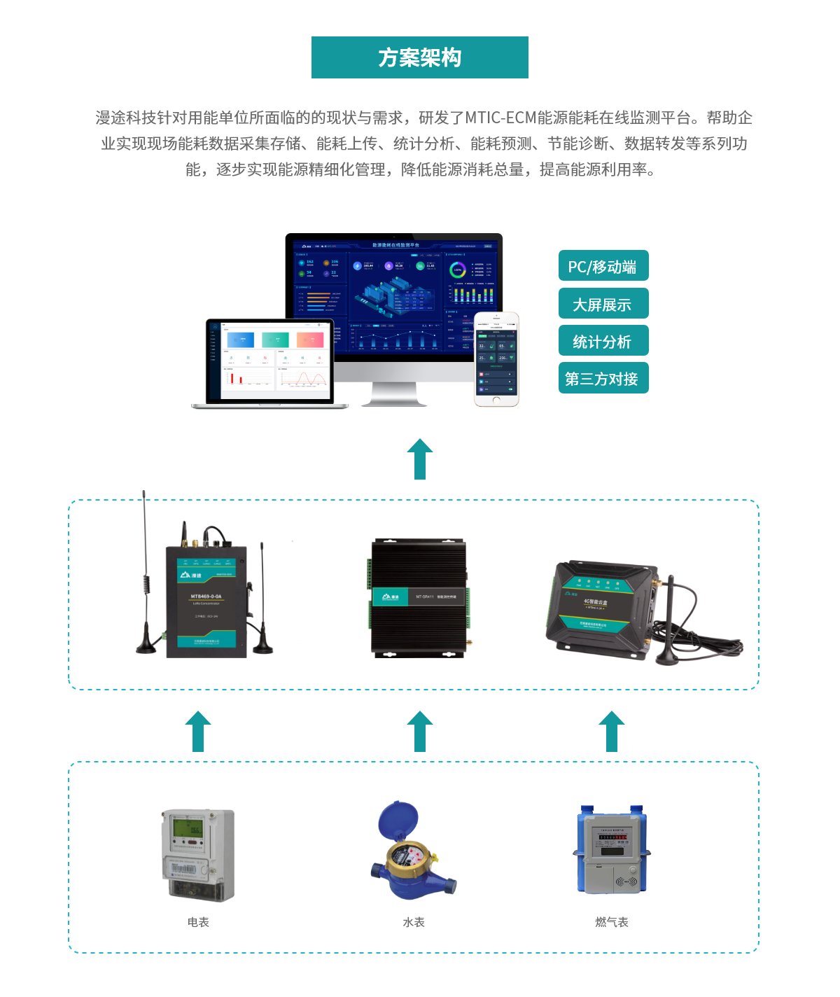 MTIC-ECM能源能耗在線監測平臺對企業的生產、輸配和消耗環節實行集中扁平化的動態監控和數據化管理,監測企業電、水、燃氣、蒸汽及壓縮空氣等各類能源的消耗情況,通過數據分析、挖掘,幫助企業針對各種能源需求及用能情況、產品能源單耗、各工序能耗、重大能耗設備的能源利用情況等進行能耗統計、同環比分析、能源成本分析碳排分析,為企業加強能源管理,提高能源利用效率、挖掘節能潛力、節能提供基礎數據和支持。