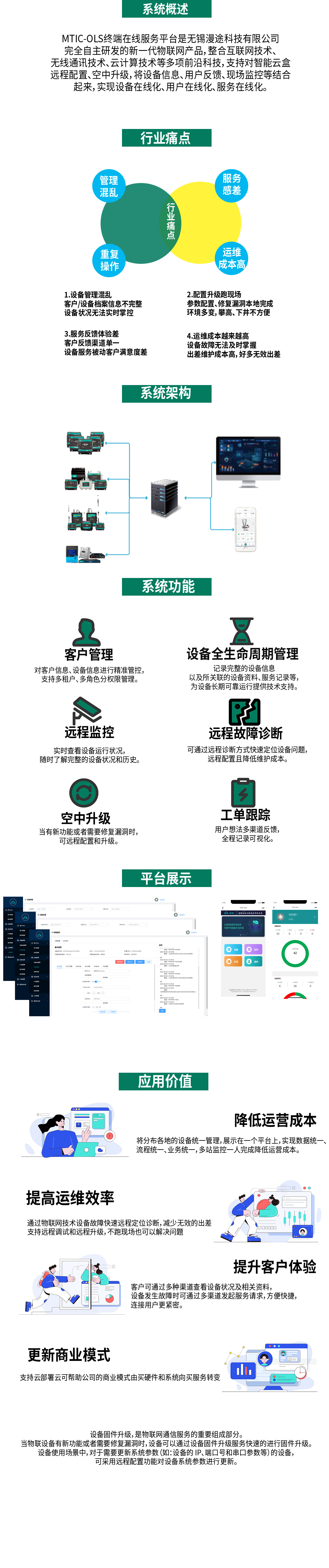 MTIC-OLS終端在線服務平臺是無錫漫途科技有限公司完全自主研發的新一代物聯網產品,整合互聯網技術、無線通訊技術、云計算技術等多項前沿科技,支持對智能云盒遠程配置、空中升級,將設備信息、用戶反饋、現場監控等結合起來,實現設備在線化、用戶在線化、服務在線化。