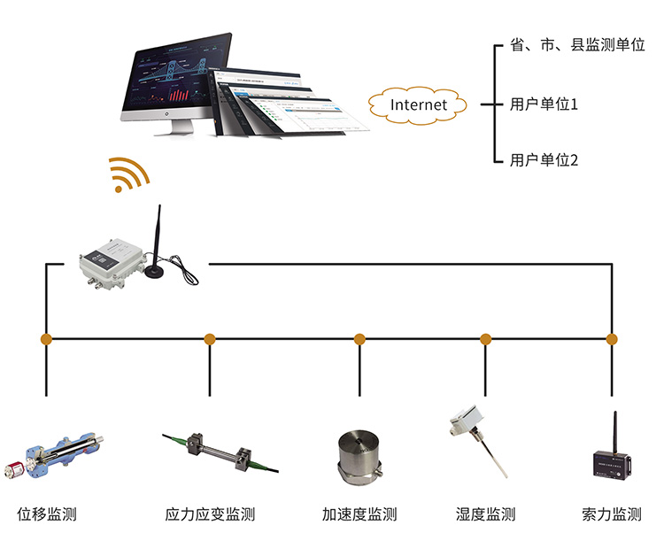 在橋梁各個(gè)位置點(diǎn)安裝漫途云盒。漫途云盒完成對(duì)橋梁應(yīng)變、振動(dòng)、溫度、沉降等動(dòng)態(tài)響應(yīng)信號(hào)的采集并存儲(chǔ),并將數(shù)據(jù)通過網(wǎng)絡(luò)遠(yuǎn)距離傳輸至漫途MTIC平臺(tái),用戶在監(jiān)控室可以通過云平臺(tái)查看實(shí)時(shí)的橋梁結(jié)構(gòu)狀態(tài)數(shù)據(jù)。