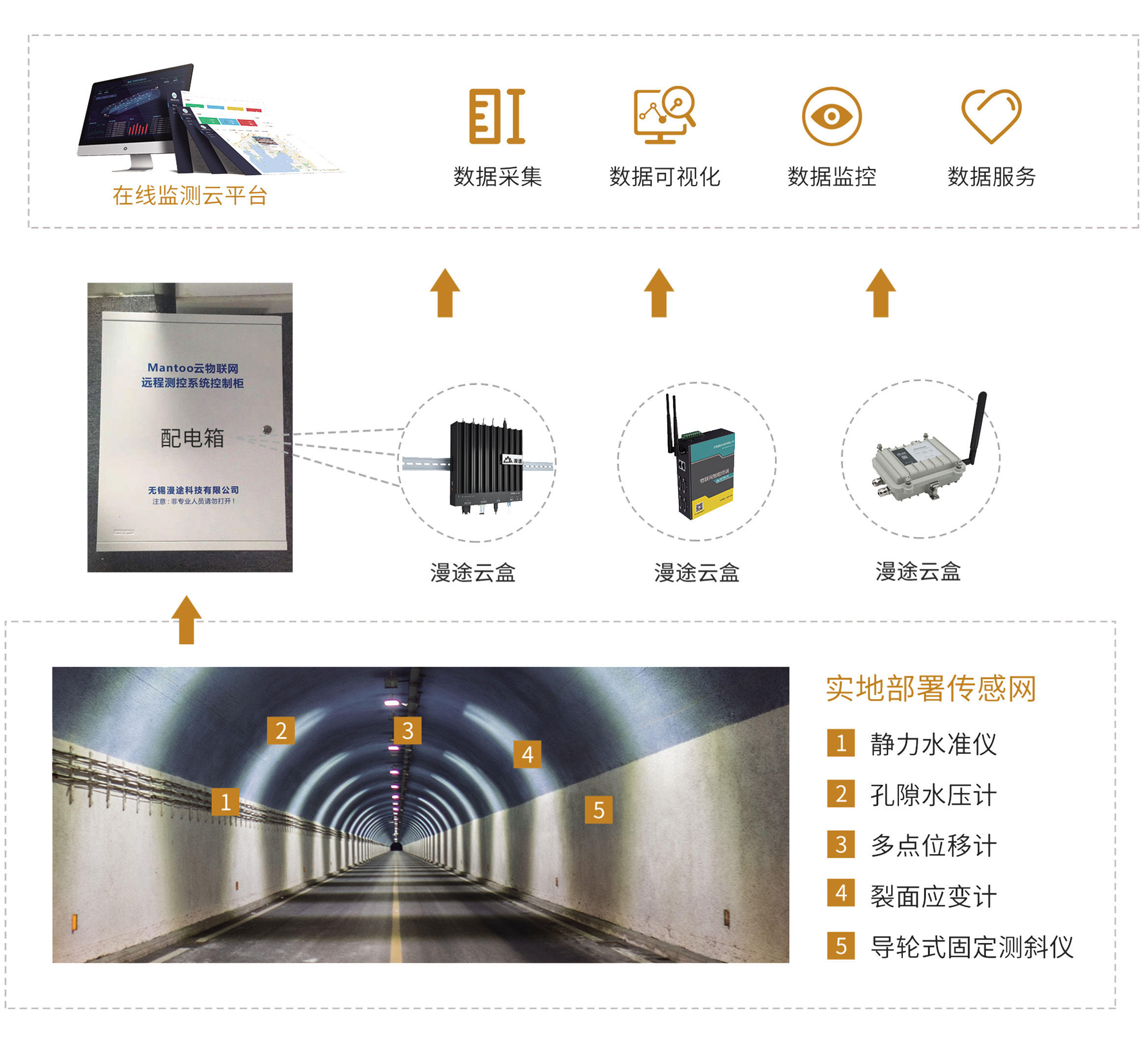 漫途隧道結構安全監測系統終端采用漫途云盒,利用物聯網技術完成對隧道應變、振動、溫度、沉降等動態響應信號的實時遠程采集、在線監測,通過MTIC云平臺進行大數據計算將隧道健康狀況展示在用戶端,同時支持多重分析預警機制,及時發現隧道隱藏安全風險,盡量減少災害的發生。