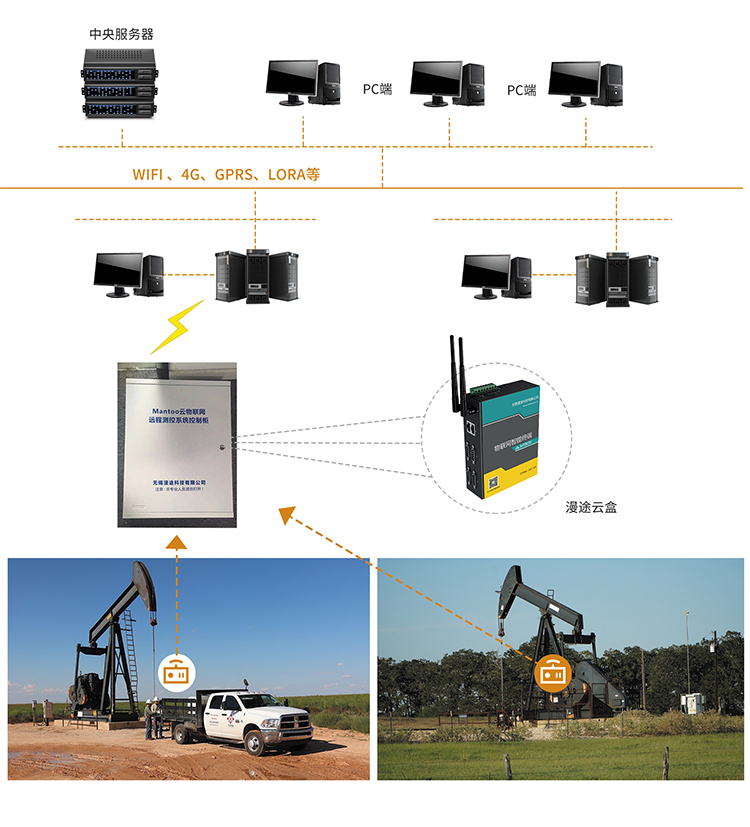 漫途根據(jù)油田的實(shí)際工作情況設(shè)計(jì)一套完整的油井監(jiān)測(cè)管理解決方案,利用漫途云盒集成油井時(shí)間控制盒、智能油嘴控制盒、壓力傳感器等,實(shí)時(shí)采集油井動(dòng)態(tài)數(shù)據(jù),上傳至云端平臺(tái)進(jìn)行實(shí)時(shí)計(jì)算分析,為管理部門決策提供強(qiáng)大的數(shù)據(jù)支撐。同時(shí)系統(tǒng)支持遠(yuǎn)程控制油井設(shè)備、參數(shù)下發(fā)、調(diào)度管理,提高生產(chǎn)、運(yùn)維效率,節(jié)約人力資源。