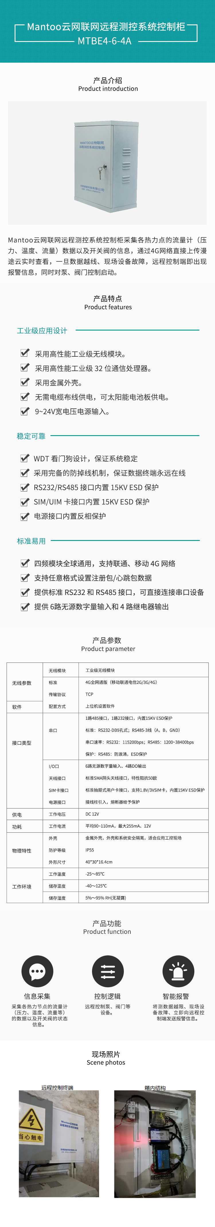 Mantoo云物聯網遠程測控系統控制柜采集各熱力點的流量計(壓力、溫度、流量)數據以及開關閥的信息,通過4G網絡直接上傳漫途云實時查看,一旦數據越線、現場設備故障,遠程控制端即出現報警信息,同時對泵、閥門控制啟動。