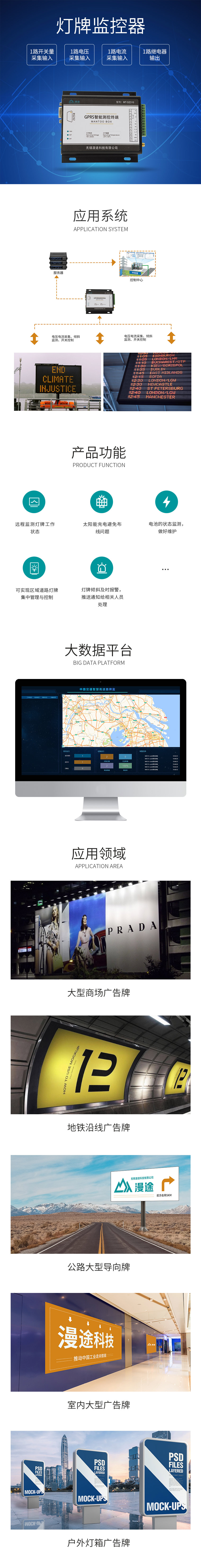 MT-DZ310燈牌監控器,支持1路開關量采集輸入、1路電壓采集輸入、1路電流采集輸入以及1路繼電器輸出,實現燈牌工作狀態遠程監測與控制。