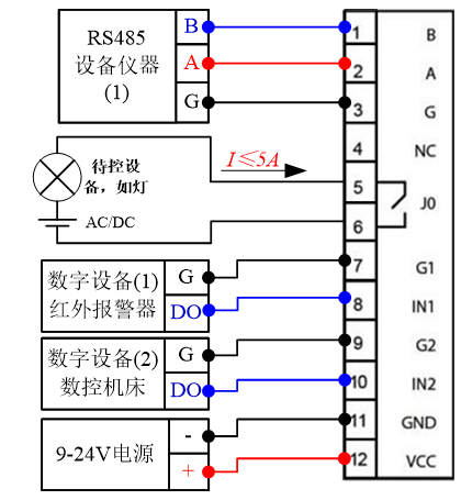 (2)多RS485設備時,采用“手拉手”接線方式;外接傳感器設備(RS485設備儀器)在電源與網關電源適配的前提下可以由網關供電。接線如圖2: