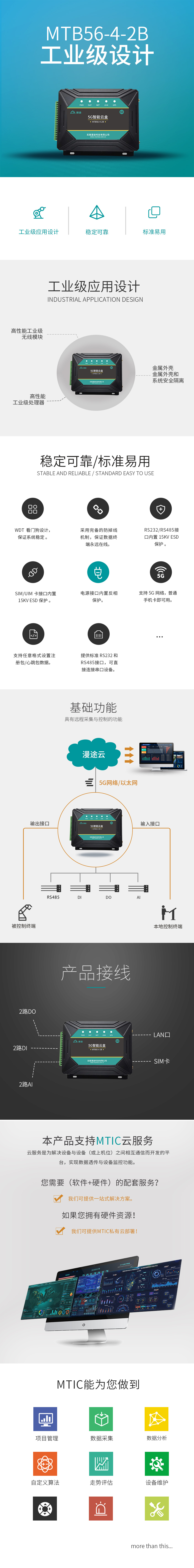 MTB56-4-2B無線遠(yuǎn)程測控終端是集數(shù)據(jù)智能采集、協(xié)議轉(zhuǎn)換、全網(wǎng)通/5G無線通信、數(shù)據(jù)處理轉(zhuǎn)發(fā)、本地存儲等功能于一體的高性能測控裝置,可以直接接入各類具有數(shù)字量、開關(guān)量和模擬量接口的傳感器和智能終端。可以實現(xiàn)數(shù)據(jù)采集與遠(yuǎn)程控制,支持本地自主決策及邏輯配置,支持協(xié)議自定義,匹配多應(yīng)用場景。