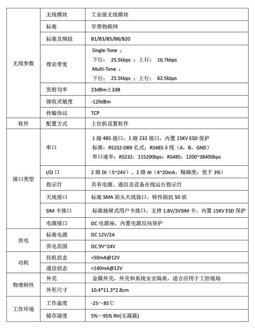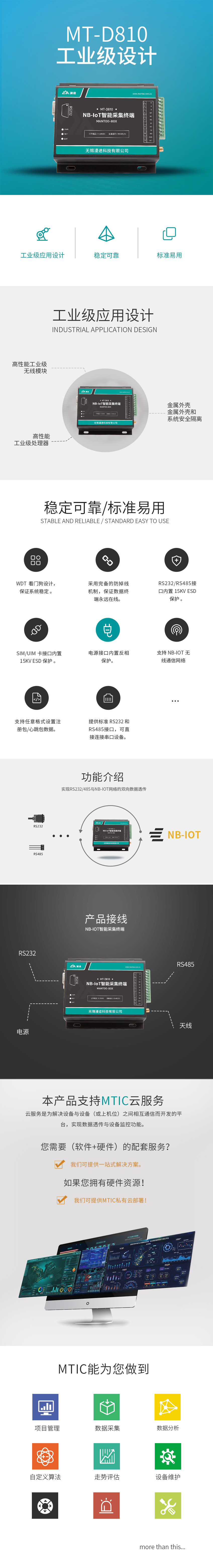 MT-D810 系列無線遠(yuǎn)程數(shù)據(jù)采集終端是一款符合工業(yè)設(shè)計標(biāo)準(zhǔn)、集成了采集和數(shù)據(jù)傳輸于一體的高性能無線采集裝置,支持接入NB-IoT無線通信網(wǎng)絡(luò)。MT-D810系列終端支持各種帶RS 232和RS 485接口的傳感器接入,可廣泛運用于水利、環(huán)保、電力、城市公共事業(yè)等領(lǐng)域的低成本數(shù)據(jù)透傳場景。