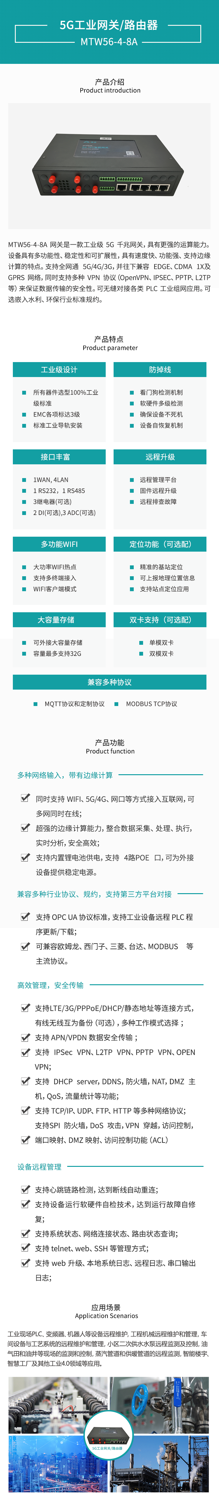 MTW56-4-8A網關是一款工業級5G千兆網關,具有更強的運算能力。設備具有多功能性、 穩定性和可擴展性,具有速度快、功能強、支持邊緣計算的特點。支持全網通5G/4G/3G,并 往下兼容EDGE、CDMA1X及GPRS網絡,同時支持多種VPN協議(OpenVPN、IPSEC、PPTP、 L2TP等)來保證數據傳輸的安全性。